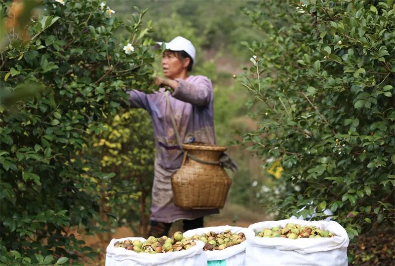 山坡上,连片的油茶树随风摇曳,一颗颗油茶果正被农户们小心采摘,这些曾经的“荒山野果”如今已成为带动群众增收的“黄金果”。