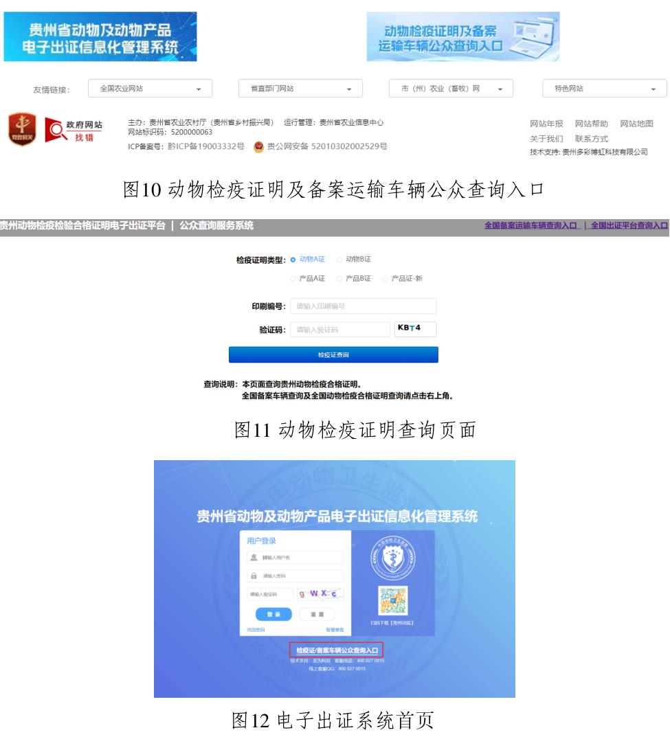 方式二:点击下方左侧“贵州省动物及动物产品电子出证信息化管理系统”图标(图10),弹出提示框后,点击“确定”跳转至电子出证系统首页,点“检疫证/车辆备案公众查询入口”(图12)进入查询页面,选择检疫证类型,输入动物检疫证明编号即可查询。