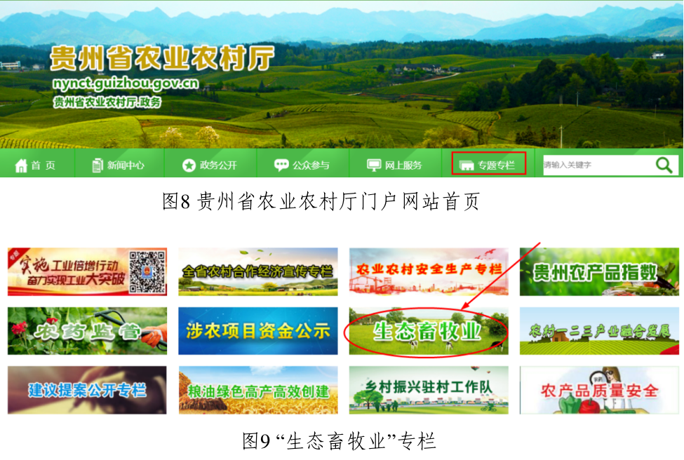 打开贵州省农业农村厅门户网站(http://nynct.guizhou.gov.cn/),选择首页点击“专题专栏”(图8),进入“生态畜牧业专栏(图9)。