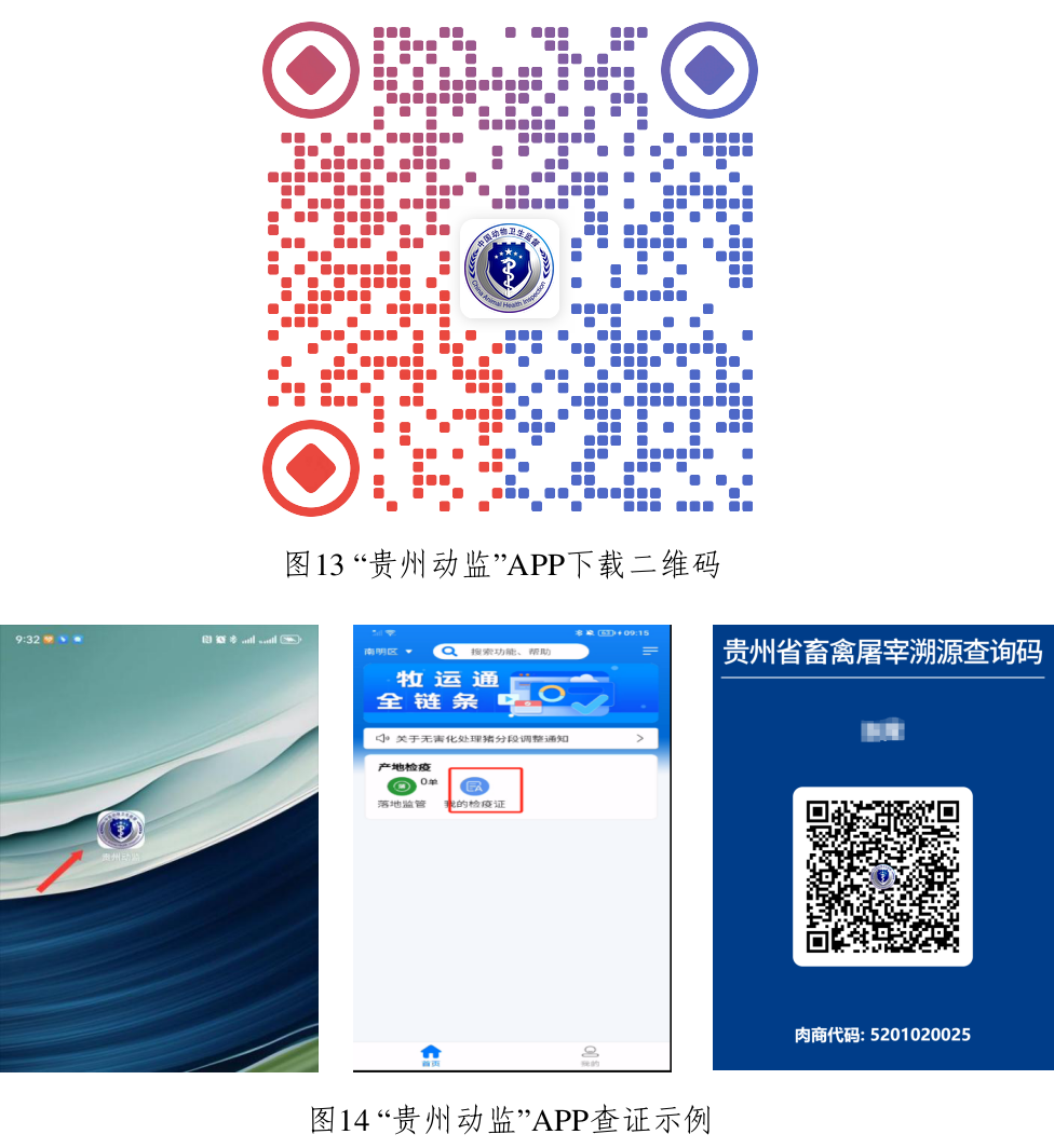 2.持证人登录查询。货主或承运人以申请出证的手机号码登录“贵州动监”APP,点击首页“我的检疫证”,查询和展示系统推送的相关检疫证信息(图14)。