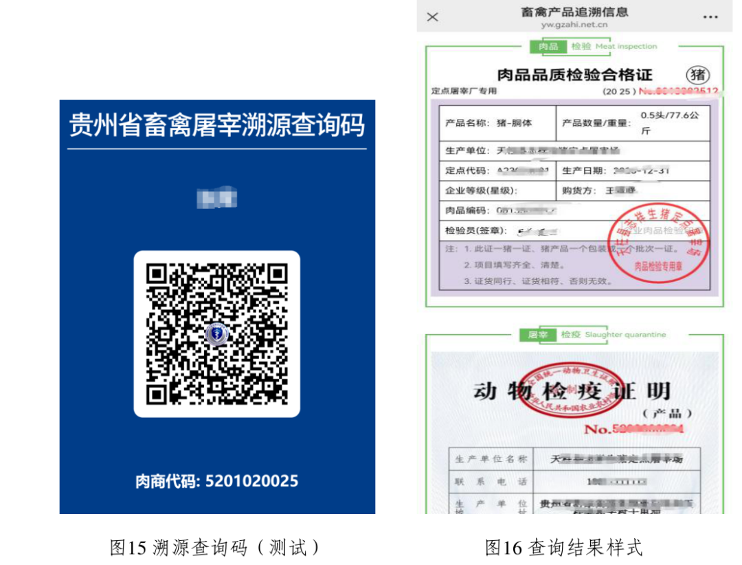 消费者通过微信“扫一扫”功能,扫商户“贵州省屠宰溯源查询码”(图15),查验或索取《肉品品质检验合格证》及其关联的《动物检疫证明(产品)》(图16)。