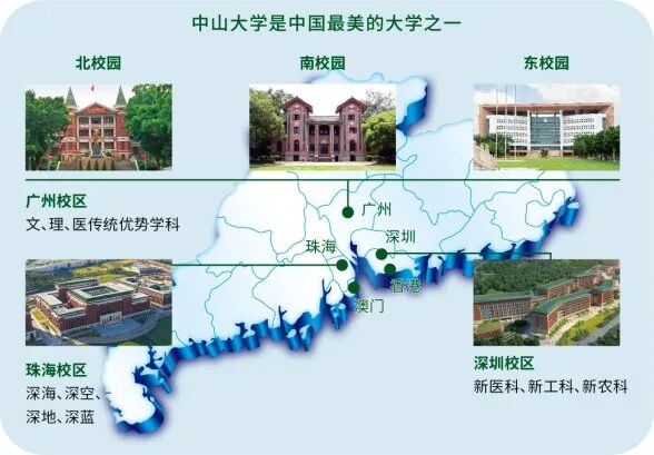 现代中大扎根湾区,创新发展。中山大学扎根粤港澳大湾区核心城市广州、深圳、珠海办学,由三个校区、五个校园及十家附属医院组成。作为教育部直属的全国重点大学,中山大学是国家“双一流”“985工程”和“211工程”建设学校,学校综合排名常年稳居国内前8、位列世界大学百强,已发展成为一所国内一流、国际知名的现代综合性大学。