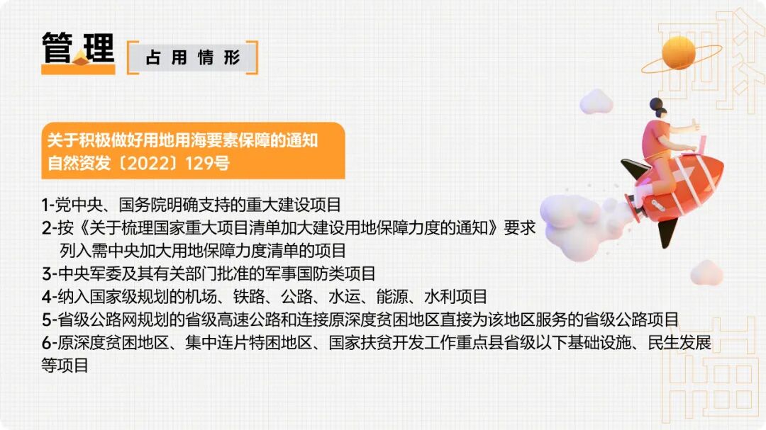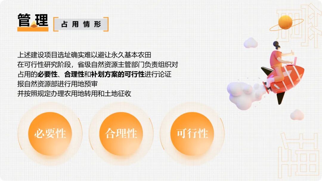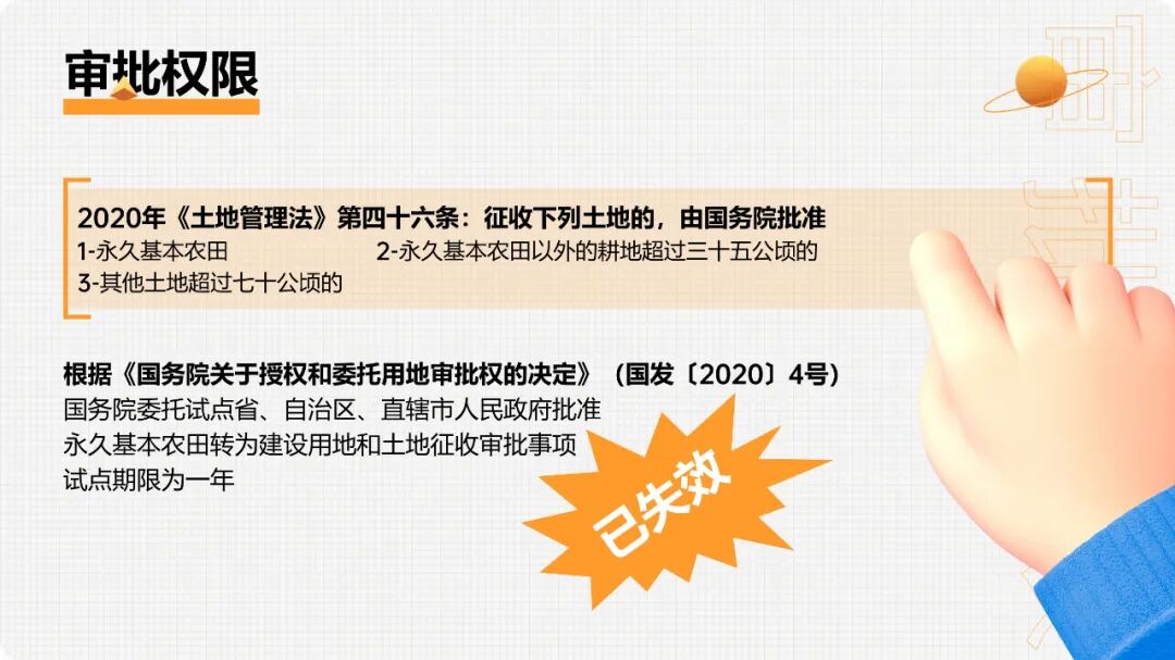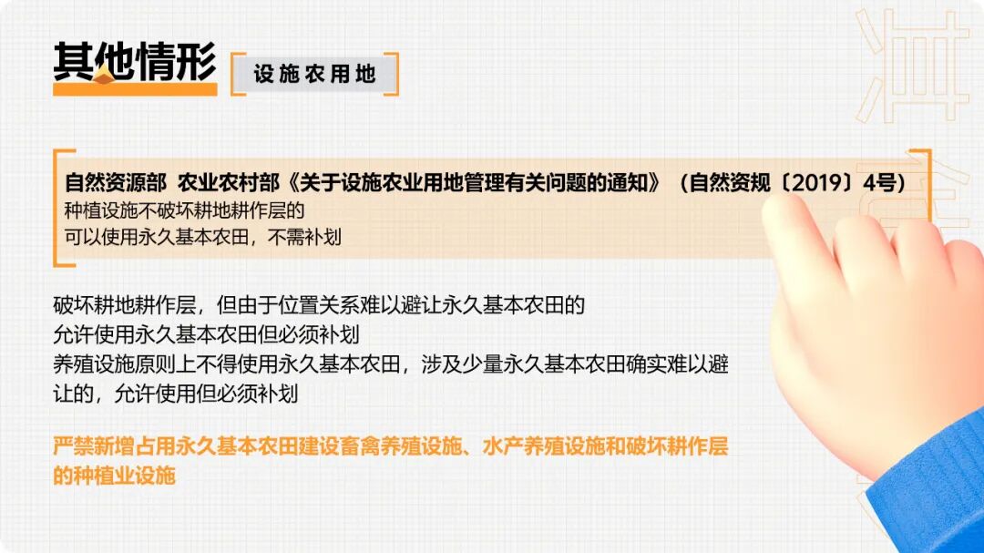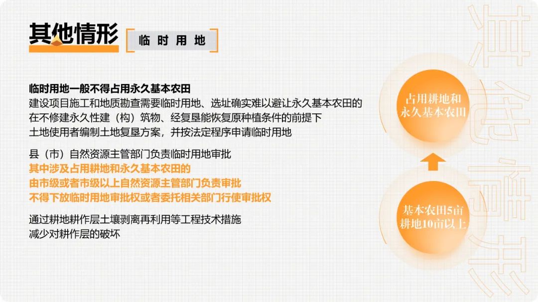 3.因自然灾害和生产建设活动严重损毁且无法复垦的耕地(二)根据《国务院关于授权和委托用地审批权的决定》(国发〔2020〕4号),国务院委托试点省、自治区、直辖市人民政府批准永久基本农田转为建设用地和土地征收审批事项,试点期限为一年。(已失效)临时用地一般不得占用永久基本农田,建设项目施工和地质勘查需要临时用地、选址确实难以避让永久基本农田的,在不修建永久性建(构)筑物、经复垦能恢复原种植条件的前提下,土地使用者编制土地复垦方案,并按法定程序申请临时用地。县(市)自然资源主管部门负责临时用地审批,其中涉及占用耕地和永久基本农田的,由市级或者市级以上自然资源主管部门负责审批,一般不超过两年。同时,通过耕地耕作层土壤剥离再利用等工程技术措施,减少对耕作层的破坏。自然资源部 农业农村部《关于设施农业用地管理有关问题的通知》(自然资规〔2019〕4号)规定,种植设施不破坏耕地耕作层的,可以使用永久基本农田,不需补划;破坏耕地耕作层,但由于位置关系难以避让永久基本农田的,允许使用永久基本农田但必须补划。养殖设施原则上不得使用永久基本农田,涉及少量永久基本农田确实难以避让的,允许使用但必须补划。严禁新增占用永久基本农田建设畜禽养殖设施、水产养殖设施和破坏耕作层的种植业设施。(三)涉及先行用地情形