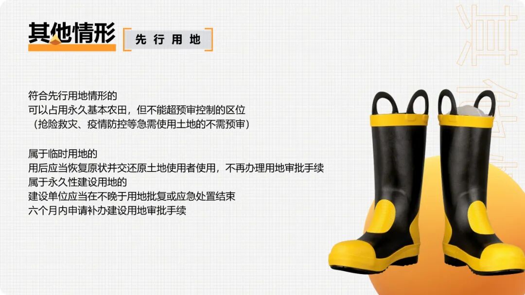 符合先行用地情形的,可以占用永久基本农田,但不能超预审控制的区位(抢险救灾、疫情防控等急需使用土地的不需预审)。属于临时用地的,用后应当恢复原状并交还原土地使用者使用,不再办理用地审批手续;属于永久性建设用地的,建设单位应当在不晚于用地批复或应急处置结束六个月内申请补办建设用地审批手续。