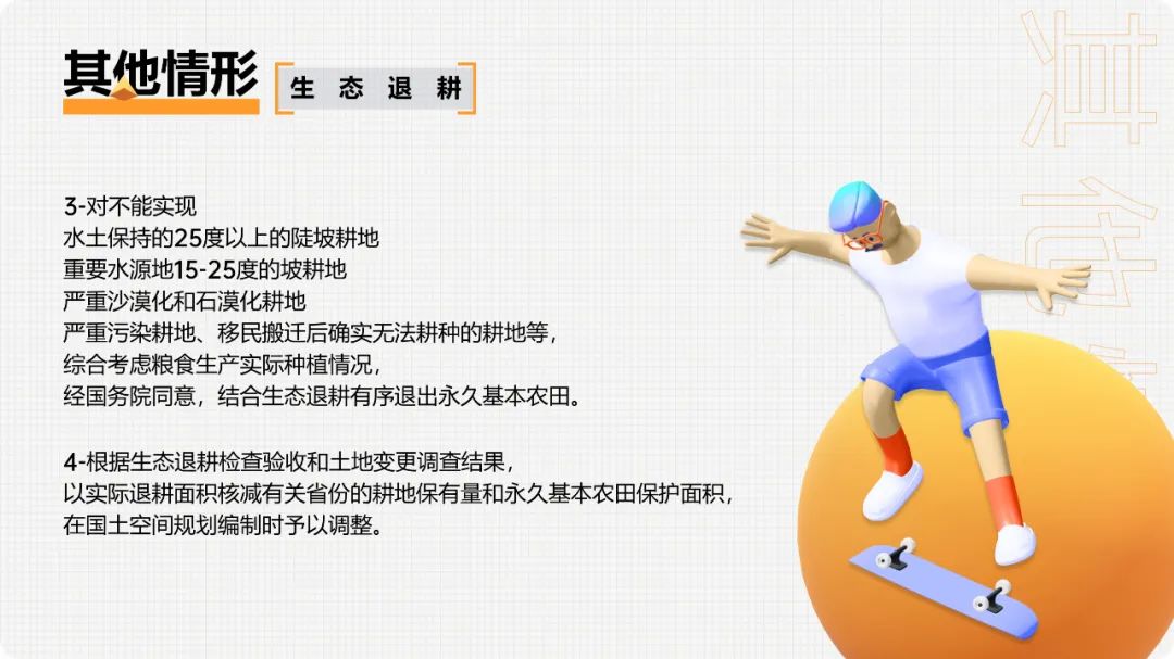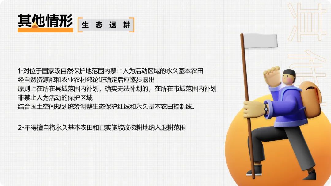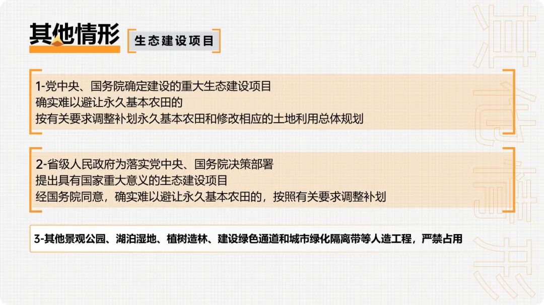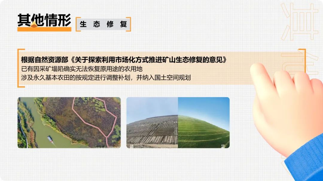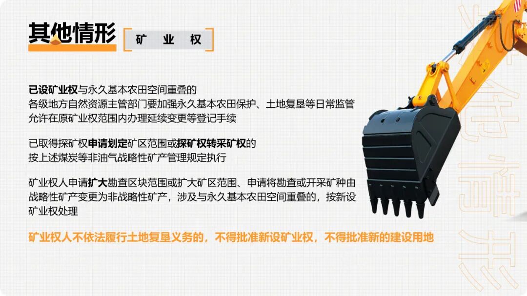 3.已设矿业权与永久基本农田空间重叠的,各级地方自然资源主管部门要加强永久基本农田保护、土地复垦等日常监管,允许在原矿业权范围内办理延续变更等登记手续。已取得探矿权申请划定矿区范围或探矿权转采矿权的按上述煤炭等非油气战略性矿产管理规定执行。矿业权人申请扩大勘查区块范围或扩大矿区范围、申请将勘查或开采矿种由战略性矿产变更为非战略性矿产,涉及与永久基本农田空间重叠的,按新设矿业权处理。矿业权人不依法履行土地复垦义务的,不得批准新设矿业权,不得批准新的建设用地。1.党中央、国务院确定建设的重大生态建设项目,确实难以避让永久基本农田的,按有关要求调整补划永久基本农田和修改相应的土地利用总体规划。2.省级人民政府为落实党中央、国务院决策部署,提出具有国家重大意义的生态建设项目,经国务院同意,确实难以避让永久基本农田的,按照有关要求调整补划。3.其他景观公园、湖泊湿地、植树造林、建设绿色通道和城市绿化隔离带等人造工程,严禁占用永久基本农田。1.对位于国家级自然保护地范围内禁止人为活动区域的永久基本农田,经自然资源部和农业农村部论证确定后应逐步退出,原则上在所在县域范围内补划,确实无法补划的,在所在市域范围内补划;非禁止人为活动的保护区域,结合国土空间规划统筹调整生态保护红线和永久基本农田控制线。2.不得擅自将永久基本农田和已实施坡改梯耕地纳入退耕范围。3.对不能实现水土保持的25度以上的陡坡耕地、重要水源地15-25度的坡耕地、严重沙漠化和石漠化耕地、严重污染耕地、移民搬迁后确实无法耕种的耕地等,综合考虑粮食生产实际种植情况,经国务院同意,结合生态退耕有序退出永久基本农田。4.根据生态退耕检查验收和土地变更调查结果,以实际退耕面积核减有关省份的耕地保有量和永久基本农田保护面积,在国土空间规划编制时予以调整。根据自然资源部《关于开展全域土地综合整治试点工作的通知》(自然资发〔2019〕194号)规定:整治区域内涉及永久基本农田调整的,应编制调整方案并按已有规定办理,确保新增永久基本农田面积原则上不少于调整面积的5%。整治区域完成整治任务并通过验收后,更新完善永久基本农田数据库。在土地整理复垦开发和高标准农田建设中,开展必要的灌溉及排水设施、田间道路、农田防护林等配套建设涉及少量占用或优化永久基本农田布局的,要在项目区内予以补足;难以补足的,县级自然资源主管部门要在县域范围内同步落实补划任务。根据自然资源部《关于探索利用市场化方式推进矿山生态修复的意见》规定:已有因采矿塌陷确实无法恢复原用途的农用地,涉及永久基本农田的按规定进行调整补划,并纳入国土空间规划。