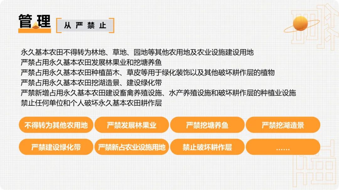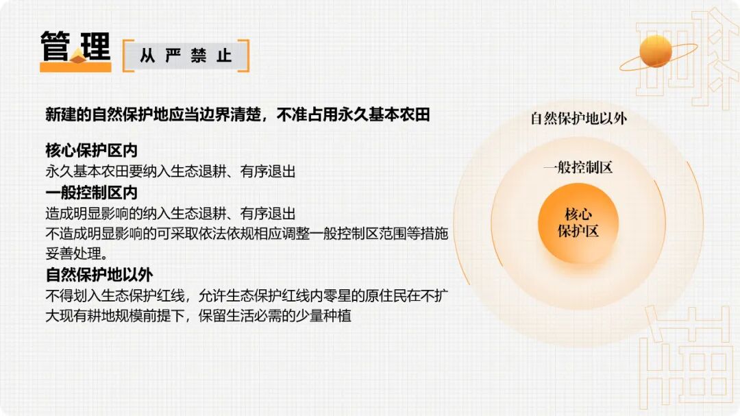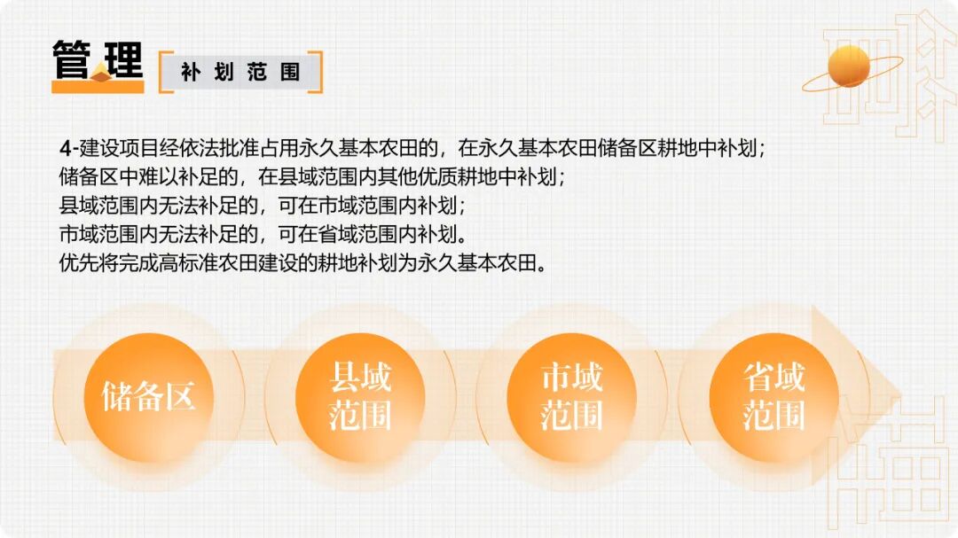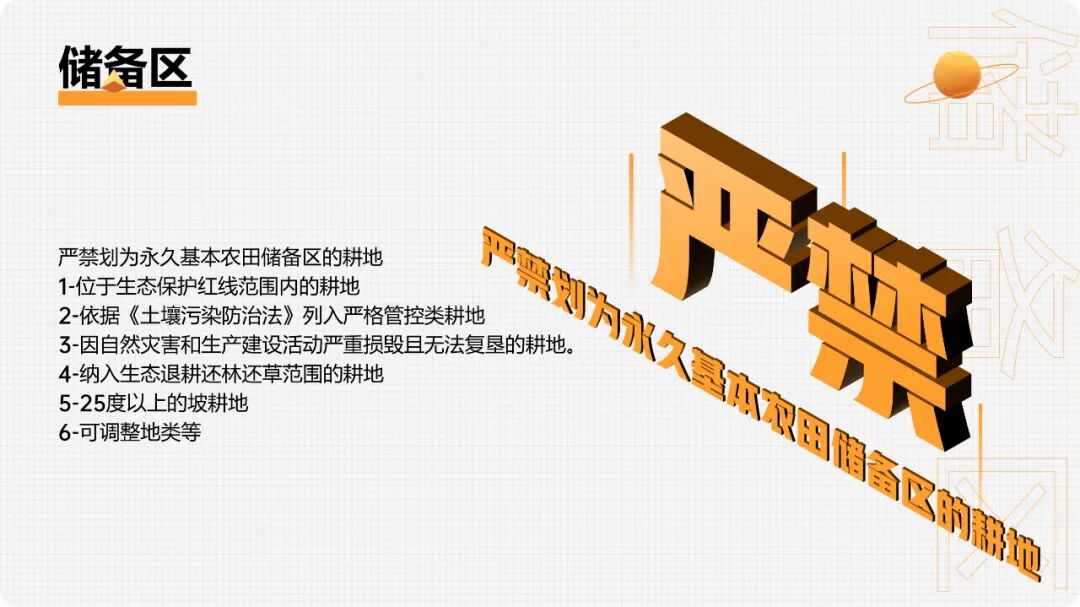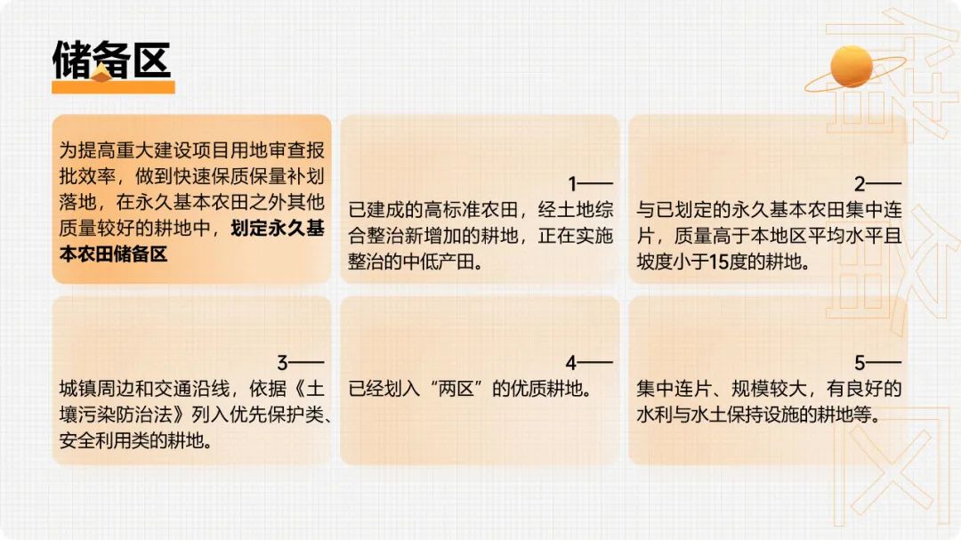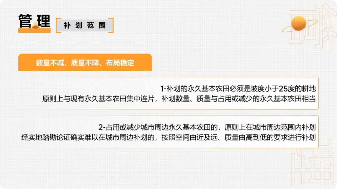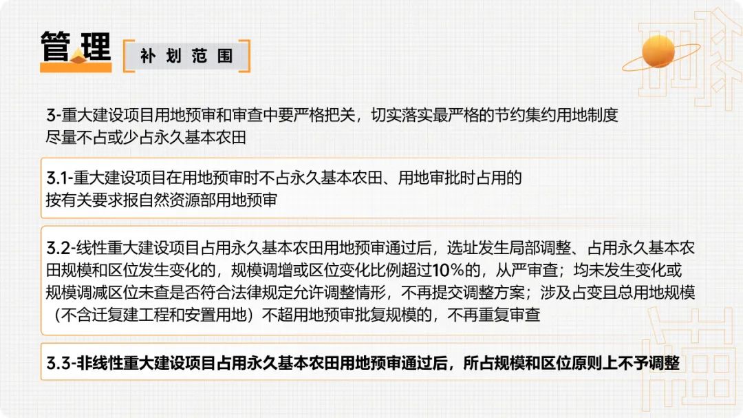 重大建设项目、生态建设、灾毁等占用或减少永久基本农田的,按照“数量不减、质量不降、布局稳定”的要求,在可以长期稳定利用的耕地上落实永久基本农田补划任务。1.补划的永久基本农田必须是坡度小于25度的耕地,原则上与现有永久基本农田集中连片,补划数量、质量与占用或减少的永久基本农田相当。2.占用或减少城市周边永久基本农田的,原则上在城市周边范围内补划,经实地踏勘论证确实难以在城市周边补划的,按照空间由近及远、质量由高到低的要求进行补划。3.重大建设项目用地预审和审查中要严格把关,切实落实最严格的节约集约用地制度,尽量不占或少占永久基本农田。(1)重大建设项目在用地预审时不占永久基本农田、用地审批时占用的,按有关要求报自然资源部用地预审。(2)线性重大建设项目占用永久基本农田用地预审通过后,选址发生局部调整、占用永久基本农田规模和区位发生变化的,规模调增或区位变化比例超过10%的,从严审查;均未发生变化或规模调减区位未查是否符合法律规定允许调整情形,不再提交调整方案;涉及占变且总用地规模(不含迁复建工程和安置用地)不超用地预审批复规模的,不再重复审查。(3)非线性重大建设项目占用永久基本农田用地预审通过后,所占规模和区位原则上不予调整。4.建设项目经依法批准占用永久基本农田的,在永久基本农田储备区耕地中补划;储备区中难以补足的,在县域范围内其他优质耕地中补划;县域范围内无法补足的,可在市域范围内补划;市域范围内无法补足的,可在省域范围内补划。优先将完成高标准农田建设的耕地补划为永久基本农田。永久基本农田不得转为林地、草地、园地等其他农用地及农业设施建设用地。严禁占用永久基本农田种植苗木、草皮等用于绿化装饰以及其他破坏耕作层的植物;严禁新增占用永久基本农田建设畜禽养殖设施、水产养殖设施和破坏耕作层的种植业设施。新建的自然保护地应当边界清楚,不准占用永久基本农田。目前已划入自然保护地核心保护区内的永久基本农田要纳入生态退耕、有序退出。自然保护地一般控制区内的永久基本农田要根据对生态功能造成的影响确定是否退出,造成明显影响的纳入生态退耕、有序退出,不造成明显影响的可采取依法依规相应调整一般控制区范围等措施妥善处理。自然保护地以外的永久基本农田和集中连片耕地,不得划入生态保护红线,允许生态保护红线内零星的原住民在不扩大现有耕地规模前提下,保留生活必需的少量种植。为提高重大建设项目用地审查报批效率,做到快速保质保量补划落地,在永久基本农田之外其他质量较好的耕地中,划定永久基本农田储备区。1.已建成的高标准农田,经土地综合整治新增加的耕地,正在实施整治的中低产田。2.与已划定的永久基本农田集中连片,质量高于本地区平均水平且坡度小于15度的耕地。3.城镇周边和交通沿线,依据《土壤污染防治法》列入优先保护类、安全利用类的耕地。5.集中连片、规模较大,有良好的水利与水土保持设施的耕地等。