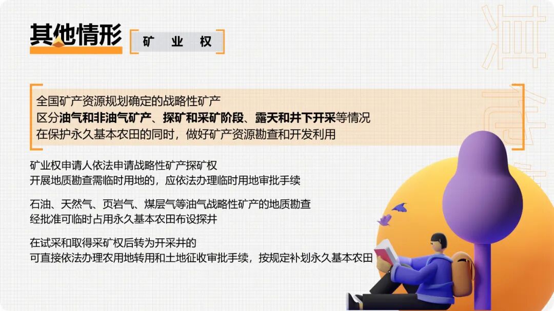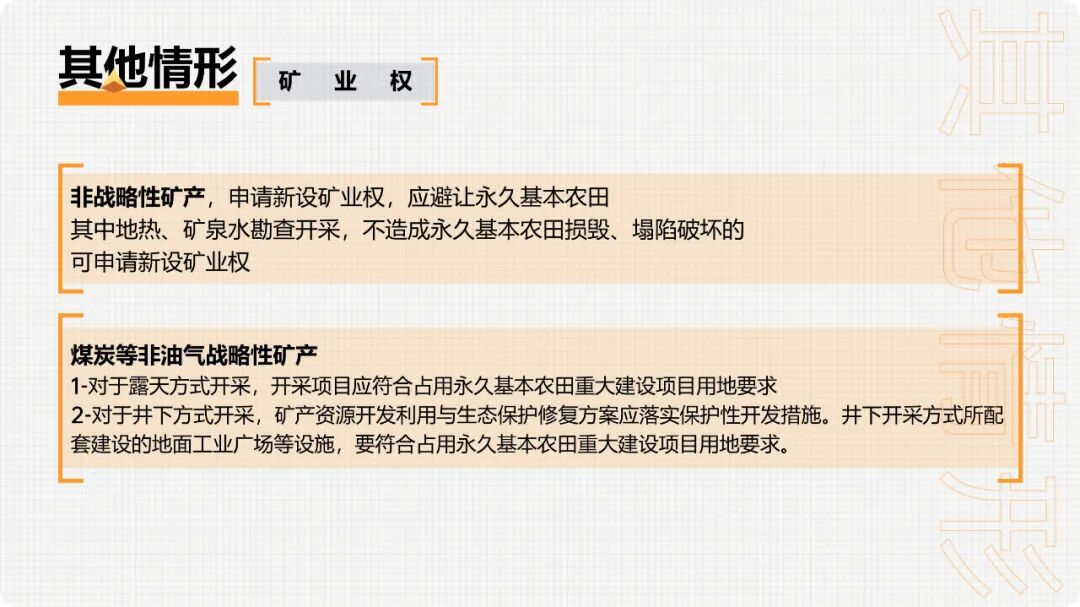 2.非战略性矿产,申请新设矿业权,应避让永久基本农田,其中地热、矿泉水勘查开采,不造成永久基本农田损毁、塌陷破坏的,可申请新设矿业权。煤炭等非油气战略性矿产,矿业权人申请采矿权涉及永久基本农田的,根据露天、井下开采方式实行差别化管理。对于露天方式开采,开采项目应符合占用永久基本农田重大建设项目用地要求;对于井下方式开采,矿产资源开发利用与生态保护修复方案应落实保护性开发措施。井下开采方式所配套建设的地面工业广场等设施,要符合占用永久基本农田重大建设项目用地要求。