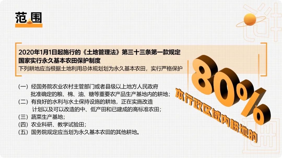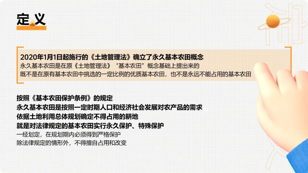 2020年1月1日起施行的《土地管理法》确立了永久基本农田概念。“永久基本农田”是在原《土地管理法》“基本农田”概念基础上提出来的,它既不是在原有基本农田中挑选的一定比例的优质基本农田,也不是永远不能占用的基本农田。